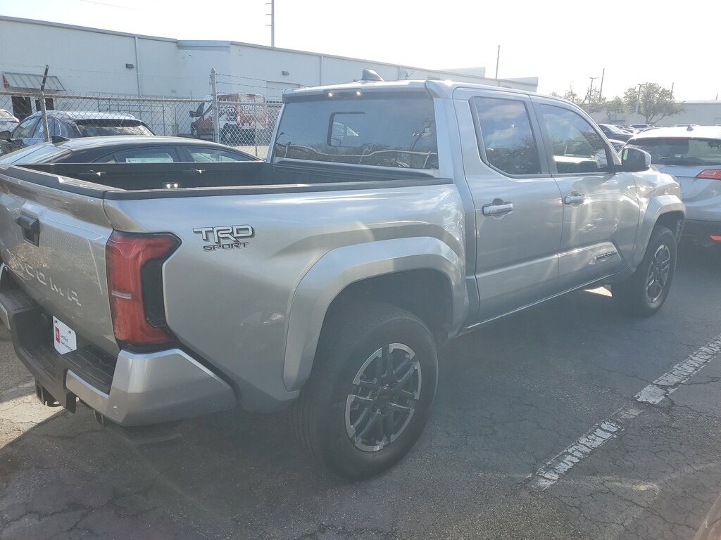 2024 Toyota Tacoma 2.4L 4-Cylinder Celestial Silver Metallic This vehicle also comes equipped with: TRD Sport Upgrade Package (8-Way Power Driver & Passenger Seat Adjusters, Digital Key Capability, Front & Rear Parking Assist w/Automatic Braking, Heated Front Seats, Heated Leather-Trimmed Steering Wheel, Integrated Trailer Brake Controller, JBL Premium Audio, and Power Horizontal Rear Window), 3.583 Axle Ratio, 4-Wheel Disc Brakes, 6 Speakers, ABS brakes, Air Conditioning, Alloy wheels, AM/FM radio: SiriusXM, Anti-whiplash front head restraints, Apple CarPlay/Android Auto, Auto High-beam Headlights, Auto-dimming Rear-View mirror, Automatic temperature control, Brake assist, Bumpers: body-color, Driver door bin, Driver vanity mirror, Dual front impact airbags, Dual front side impact airbags, Electronic Stability Control, Emergency communication system: Safety Connect (1-year trial), Exterior Parking Camera Rear, Fabric Seat Trim (FE), Four wheel independent suspension, Front anti-roll bar, Front Bucket Seats, Front Center Armrest, Front fog lights, Front reading lights, Fully automatic headlights, Heated door mirrors, Illuminated entry, Knee airbag, Leather Shift Knob, Leather steering wheel, Low tire pressure warning, Occupant sensing airbag, Outside temperature display, Overhead airbag, Overhead console, Panic alarm, Passenger door bin, Passenger vanity mirror, Power door mirrors, Power steering, Power windows, Radio: 8 Toyota Audio Multimedia, Rear step bumper, Rear window defroster, Remote keyless entry, Security system, Speed control, Speed-sensing steering, Split folding rear seat, Steering wheel mounted audio controls, Tachometer, Telescoping steering wheel, Tilt steering wheel, Traction control, Trip computer, Turn signal indicator mirrors, Variably intermittent wipers, and Wheels: 18 TRD Sport Alloy. RWD 8-Speed Automatic Recent Arrival! Priced below KBB Fair Purchase Price!